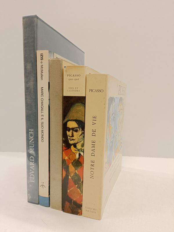 Compongono il lotto: 1) Quinn Edward, Picasso al lavoro. Un'intima biografia fotografica... Milano: Longanesi, 1965. 2) Daix P., Boudaille G., Picasso 1900-1906. Catalogue raisonné de l'oeuvre peint. Neuchâtel: Edit. Ides et Calendes, 1966. 3) Parmelin Hélène, Picasso. Notre Dame de Vie. Roma: Editori Riuniti, 1966. 4) Mcmullen Roy, Marc Chagall e il suo mondo. Milano: Il Saggiatore, 1968. 5) Langaard Johan Henrik, Edward Munch. Calcografie, litografie, silografie. Firenze: La Nuova Italia, 1970.