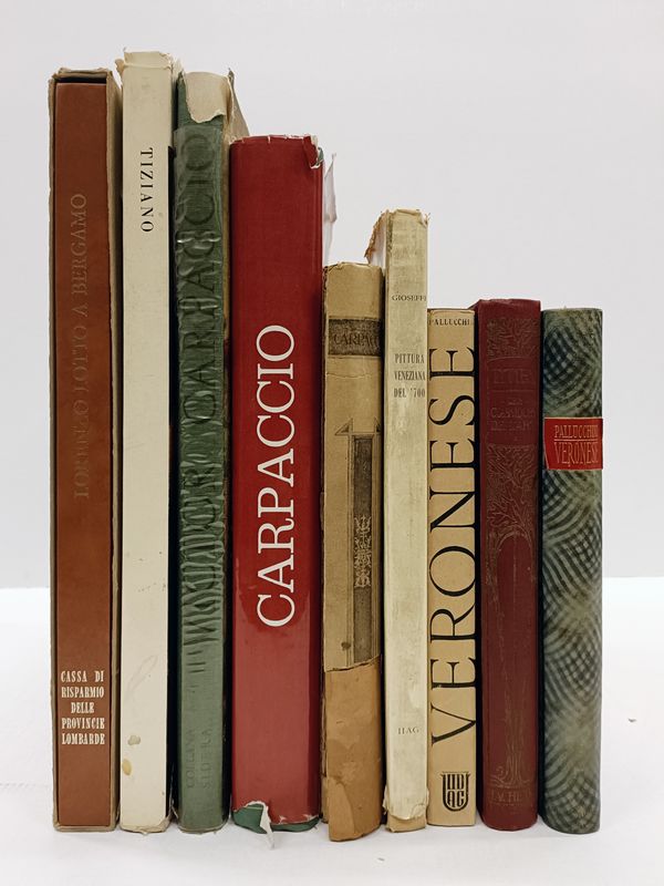 Compongono il lotto: 1) Fiocco Giuseppe, Carpaccio. 201 riproduzioni in fototipia. Roma: Valori Plastici, s.d. 2) Pallucchini Rodolfo, Veronese. 152 tavole in rotcalco ed 1 tricromia. Bergamo: Istituto Italiano d'Arti Grafiche, 1943. 3) Gioseffi Decio, La pittura veneziana del Settecento. Bergamo: Istituto Italiano d'Arti Grafiche, 1956. 4) Titien. L'oeuvre du maitre. Ouvrage illustré de 284 gravures. Paris: Librairie Hachette, s.d. 5) Muraro Michelangelo, Carpaccio. Firenze: Edizioni d'Arte il Fiorino, 1966. Elenco completo disponibile su richiesta.