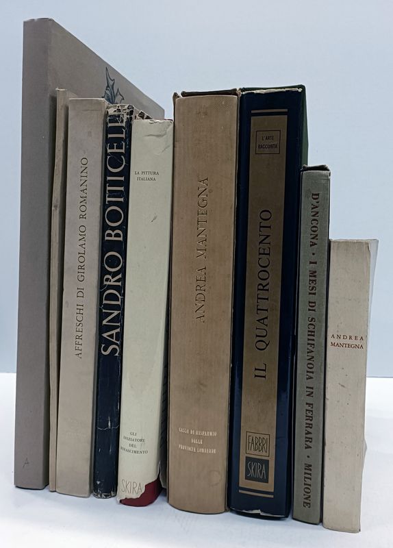 Compongono il lotto: 1) Venturi Lionello, La pittura italiana. Primo volume. Gli iniziatori del Rinascimento. Ginevra: Skira, 1956. 2) Paccagnini Giovanni, Andrea Mantegna. Milano: A. Pizzi (Cassa di Risparmio delle Provincie Lombarde), 1961. 3) Baumgart Fritz, Martin Schongauer. Incisioni. Firenze: La Nuova Italia, 1978. 4) Micheletti Emma, Piero della Francesca. Novara: Istituto Geografico De Agostini, 1960. 5) I grandi Cicli decorativi. Il Quattrocento. Introduzione di Pietro Scarpellini. Milano-Ginevra: Fabbri-Skira, 1965. Elenco completo disponibile su richiesta.