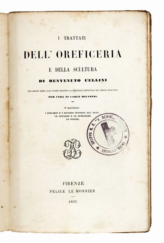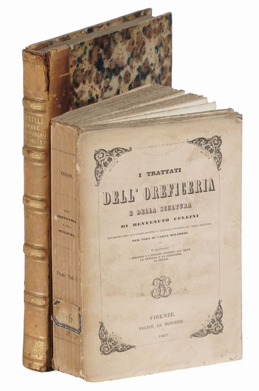 In-4° (mm 223x143). Buone condizioni interne. Legatura coeva in mezza pelle con piatti in carta marmorizzata e titolo impresso in oro al dorso. Mancanze lungo le cerniere. SI AGGIUNGE: Cellini Benvenuto, I trattati dell'orificeria e della scultura... Firenze: Felice Le Monnier, 1857.