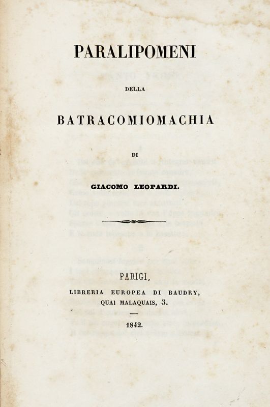 In-8° (mm 185x120). Brossura editoriale con titoli in nero al piatto anteriore e Avviso a quello posteriore; dorso parzialmente assente e uno strappo senza mancanze al piatto. SI AGGIUNGE: Monti Vincenzo, Due errata corrige sopra un testo classico del buon secolo della lingua. Milano: dalla Società tipografica de' Classici italiani, 1820. SI AGGIUNGE: Id., Opere inedite e rare [...]. Volume unico. Lugano: Tipografia di G. Ruggia, 1843. SI AGGIUNGE: Paganini Cesare, La Paglianeide, ossia, Teatro e medicina. Poema eroi-comico-storico-critico-filosofico... Firenze: coi tipi di F. Le Monnier, 1854. Elenco completo disponibile su richiesta.