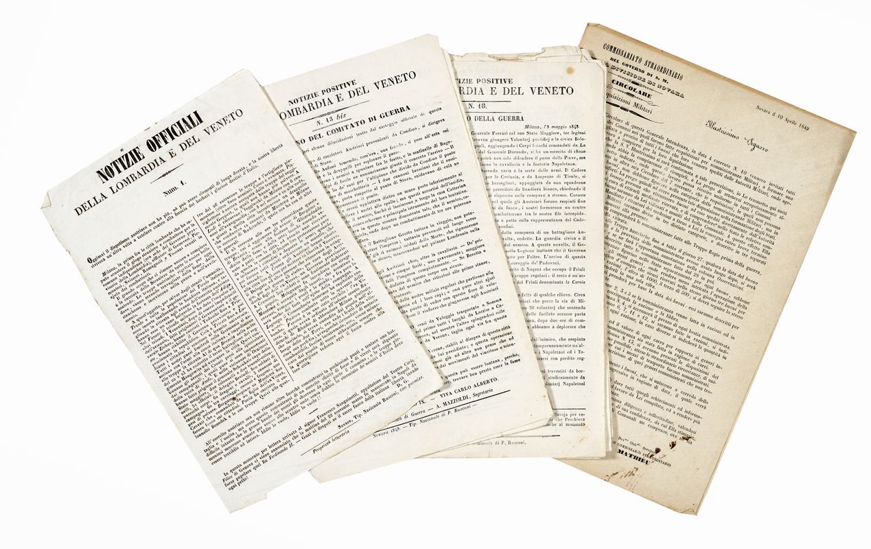 Documenti a stampa. Dimensioni: 300x210 mm (il più grande). SI AGGIUNGE: 1 lettera a stampa di Vincenzo Gioberti “sui fatti di Francia”. Datata 26 febbraio 1848. SI AGGIUNGONO: 2 manifesti del Lombardo Veneto datati 1852 e 1853 e 1 bollettino dal titolo “Arrivo e Confessione di Carlo Alberto in Ispagna”. SI AGGIUNGONO: 7 numeri di giornali (Gazzetta di Mantova, Il Corriere torinese, La Perseveranza, Gazzetta Piemontese, L’Alleanza, Nazione). Datati 1814-1864.