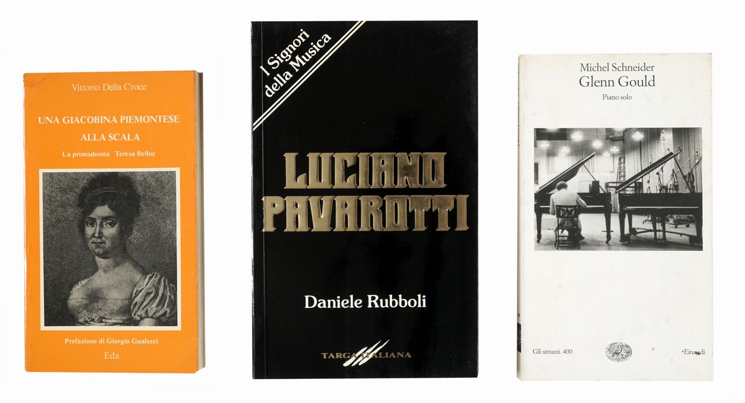 La raccolta comprende: L. Schneider “Massenet. L’Homme – Le Musicien” (Parsi, L. Carteret 1908) - M. Casadei Turroni Monti “Le musiche di Renato Serra” – “Gustav Mahler” (a cura di Franco Pulcini) – “The great instrumentalists in historic photographs. Edited by James Camner” – “Stars of the American musical theater in Historic Photograph. 361 Portraits from the 1860s to 1950” - “The great composers in historic photographs. Edited by James Camner” – “The great opera stars in historic photographs. Edited by James Camner” – G. Moscatelli “A Milano con Verdi” – M. Schneider “Glenn Gould” – G. C. Maggi “Mozart & dintorni” – Covent Garden Books 14 – Y. Carbou. “La lecon de musique d’Yvonne Lefebure” – V. Della Croce. “Una giacobina piemontese alla Scala. La primadonna Teresa Belloe” – R. Celletti. “La storia del belcanto” – D. Rubboli. “Luciano Pavarotti” – V. R. Bisogni. “Franco Corelli Irresistibile tenore” – U. Bonafini. “Perché sono Renata Scotto” – P. Gargano. “Una vita. Una leggenda. Enrico Caruso il più grande tenore del mondo” – B. Baudissone. “Principessa Turandot. La voce e l’arte di Gina Cigna” – U. Pirovano. “Otello fu. La vera vita di Francesco Tamagno” – D. Rubboli. “Cronache di voci modenesi” – “Aldo Finzi”. A cura i Eleonora Carapella e Raffaele Deluca - H. Hoffmann. “Carl Maria von Weber. Leben und Werk – W. Riezler. “Beethoven” – H. J. Froehlich. “Schubert” – P. Robinson. “Herbert von Karajan. Grosse Dirigenten”.