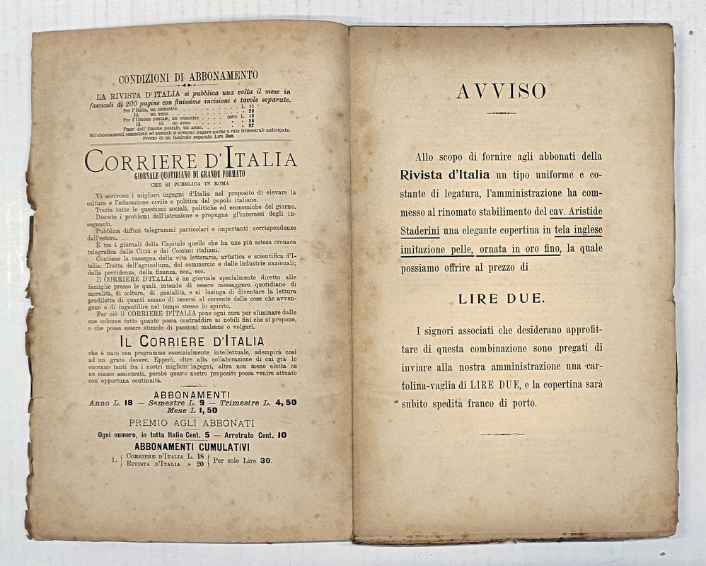 156 fascicoli in-8° (mm 250x170). 13 annate complete, ciascuna composta da 12 fascicoli: anno III-V (1900-02); anno VIII-X (1905-07); anno XII-XIII (1909-10); anno XXXIII-XXIV (1920-21); anno XXVI (1923); anno XXIX-XXX (1926-27). Con numerose tavole illustrate fuori testo. Fascicoli intonsi e in barbe. Pagine brunite e fioriture sparse. Alcune carte staccate. Brossure editoriali con titoli in nero e rosso. SI AGGIUNGONO: Rivista d'Italia. 147 fascicoli in-8°. 16 annate scomplete. Assenti i seguenti fascicoli: anno I (1898) n. 1-3, 5-7, 11-12; anno II (1899) n. 1; anno VI (1903) n. 1, 10; anno XI (1908) n. 2; anno XIV (1911) n. 11-12; anno XV (1912) n. 1-2; anno XVI (1913) n. 8-11; anno XVII (1914) n. 2, 4, 6, 12; anno XVIII (1915) n. 2, 4, 6, 8-12; anno XIX (1916) n. 2, 4, 6, 9; anno XX (1917) n. 2, 4; anno XXII (1918) n. 2; anno XXV (1922) n. 5, 6; anno XXVII (1924) n. 6; anno XXVIII (1925) n. 5, 7; anno XXXI (1928) n. 11. SI AGGIUNGONO: Rivista d'Italia. 5 fascicoli doppi di varie annate.