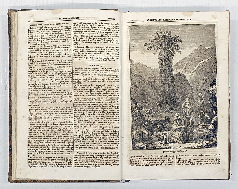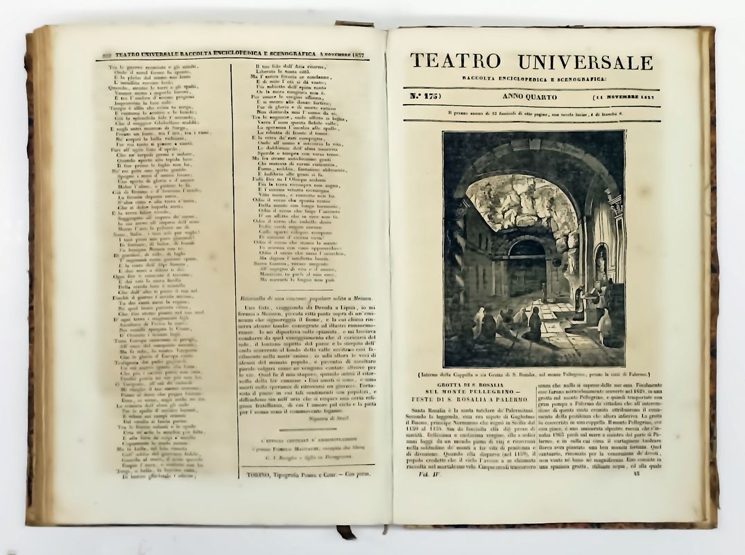 11 volumi in-4° (mm 280x188). 11 annate complete, dall'anno I (1834) all'anno XI (1844). Con moltissime incisioni in legno nel testo. Alcune carte brunite, soprattutto in corrispondenza del testo e fioriture sparse. Legatura coeva in mezza pergamena e in mezza pelle, entrambe con piatti in carta marmorizzata. Piccoli fori di tarlo ai dorsi. SI AGGIUNGONO: Teatro Universale. Raccolta enciclopedica e scenografica... 7 volumi in-4°. Anno III (1836); anno IV (1837) in doppia copia; anno V (1838) in doppia copia; anno VI (1839) in doppia copia.