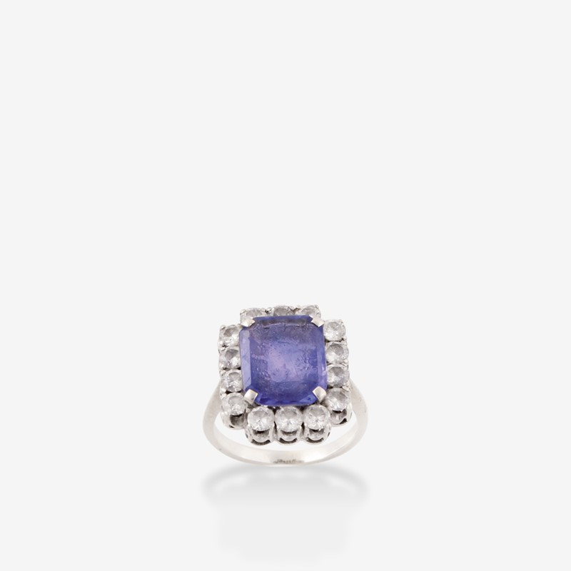 in oro bianco con zaffiro centrale a forma rettangolare del peso di 5,00 ct ca., brillanti a contorno del peso complessivo di 1,00 ct ca., gr. 6,6. Misura 12,5