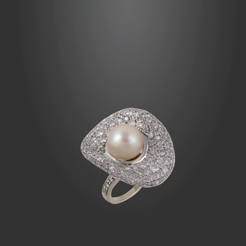 in oro bianco con perla coltivata 9,5 mm, pavè in brillanti del peso complessivo di 3,50 ct ca.gr. 12,2. Misura 12