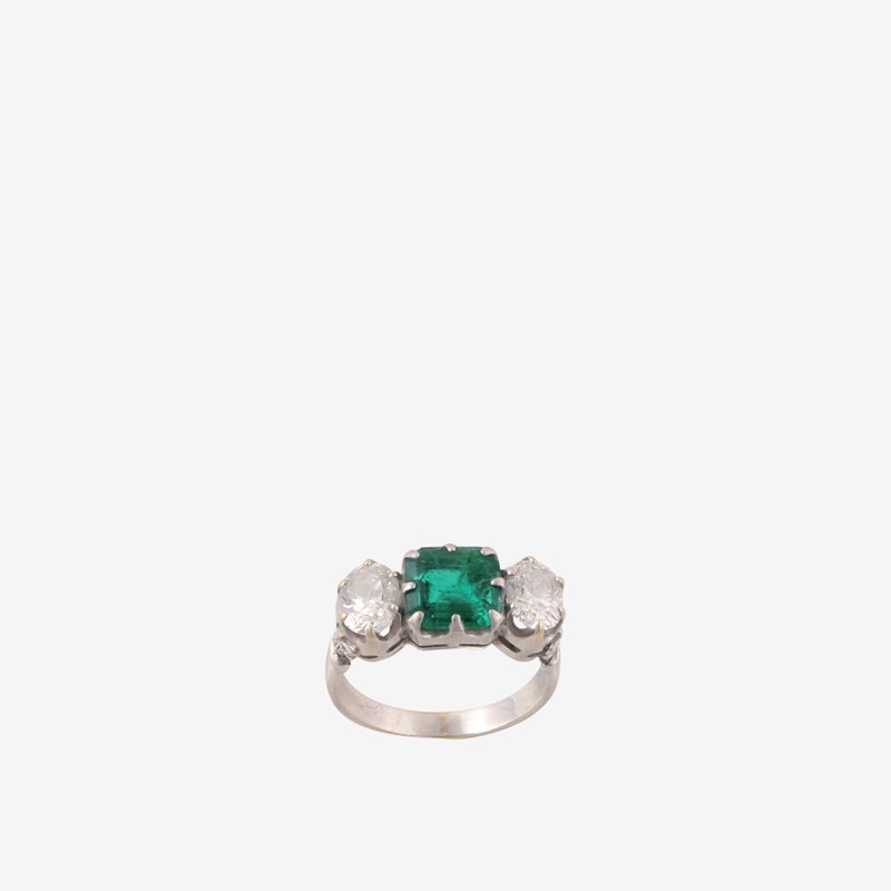 in oro bianco con smeraldo centrale (sbeccato) affiancato da diamanti a forma ovale del peso complessivo di 1,20 ct ca., gr. 5,8. Misura 14