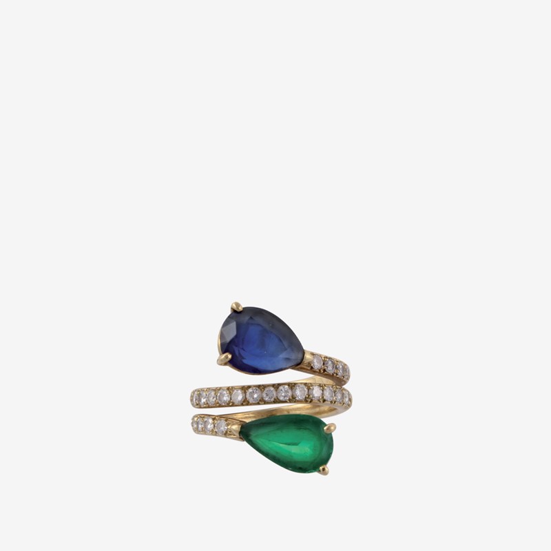 contrarič in oro giallo con zaffiro e smeraldo forma a goccia. Zaffiro del peso di 3,00 ct ca., smeraldo 2,80 ct ca., brillanti, gr. 11,3. Misura 15
