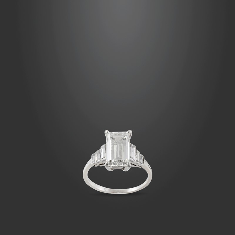 in platino con diamante forma rettangolare ad angli tronchi del peso di 3,43 ct ca., diamanti baguette sul gambo, gr. 4,6. Misura 16