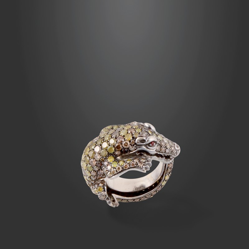 in oro bianco, raffigurante un coccodrillo con diamanti multicolori, gr. 15,9. Misura 14