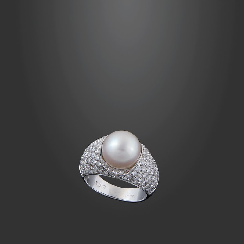 in oro bianco con perla coltivata 9,8 mm, brillanti a contorno del peso complessivo di 1,00 ct ca., uno mancante, gr. 10. Misura 10,5