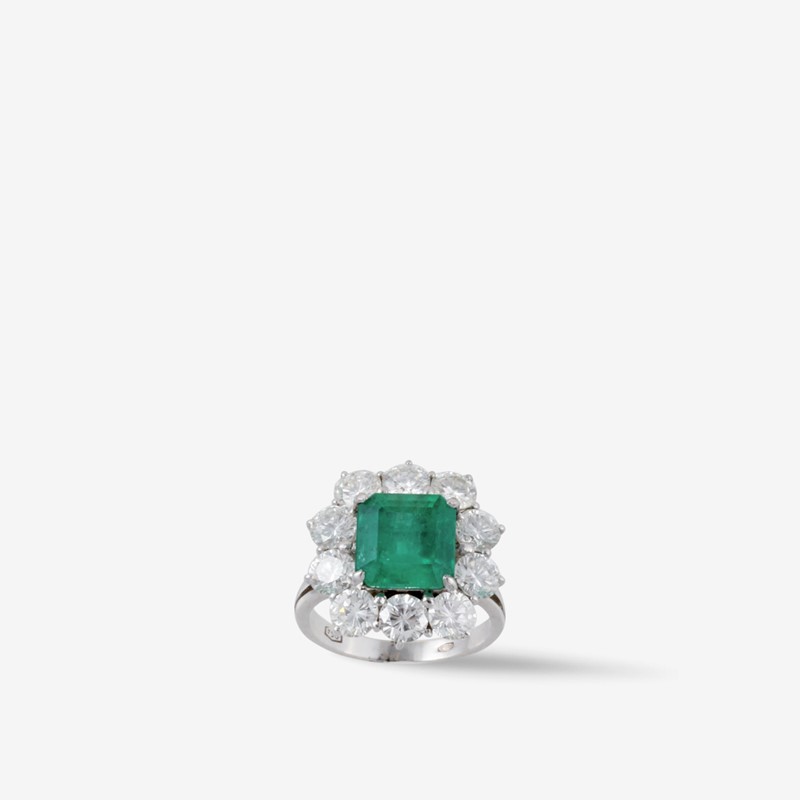 in oro bianco con smeraldo forma quadrata ad angoli tronchi del peso di 3,00 ct ca., diamanti ad ornamento del peso complessivo di 2,50 ct ca., gr. 5,4. Misura 9