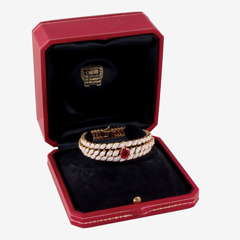 in oro giallo, rubino centrale a forma ovale del peso di 2,38 ct, ornato da tre rivière a scalare di diamanti del peso complessivo di 28,00 ct ca., gr. 42,1. Corredato da custodia originale. Lunghezza 18,5 cm Punzoni francesi Numero: 228764 Firmato: Cartier Analisi gemmologica n. 53236 – 23-09-2022 rilasciata dal laboratorio IGI di Milano attestante che la gemma è di provenienza Myanmar e non ha subito trattamento termico.