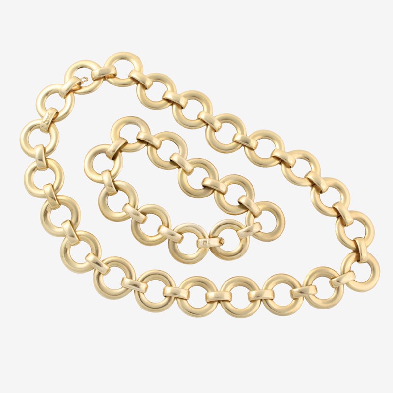 in oro giallo a elementi circolari concatenati, gr. 157,7. Lunghezza bracciale 22 cm Lunghezza collana 45 cm Numerario: 15 VR (Weingrill Carlo S.p.a – Verona)