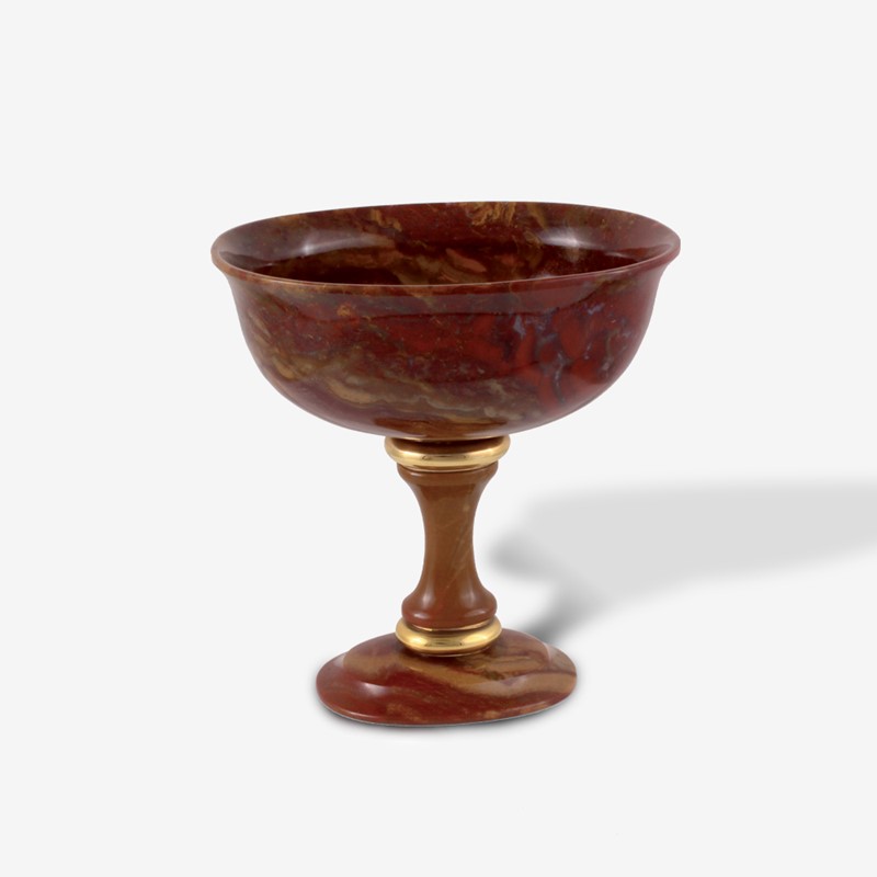 in diaspro sanguigno a striature multicolore nei toni del rossiccio e marrone, monoblocco con base. Bordure in oro. Dimensioni 15,5x14,5x11,1 cm