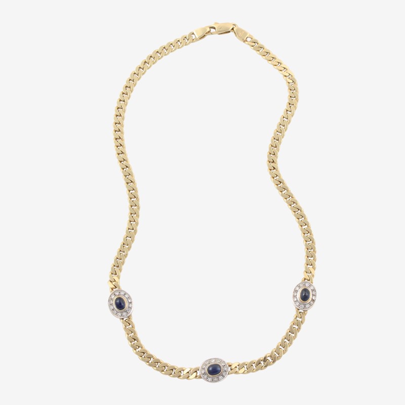 in oro giallo “groumette” a tre elementi ovali con zaffiri cabochon centrali, brillanti ad ornamento, gr. 36,1. Lunghezza 41 cm