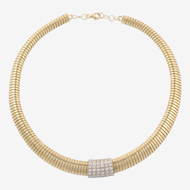 in oro giallo e bianco “tubo gas” con al centro sezione tubolare con sei rivière di brillanti del peso complessivo di 1,50 ct ca., gr. 85,7. Lunghezza 40 cm