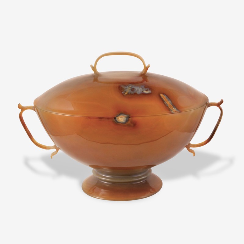 a forma ovale. pomello e manici in agata striata multicolore nei toni del rossiccio, marrone e grigio, coppa monoblocco. Dimensioni 14,5x15x11,5 cm