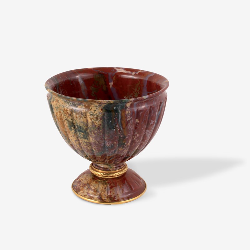 fesonata, levigata all’interno, nei toni del rosso e marrone, monoblocco con base, piede bordato in oro. Dimensioni 11,5x12x12,1 cm