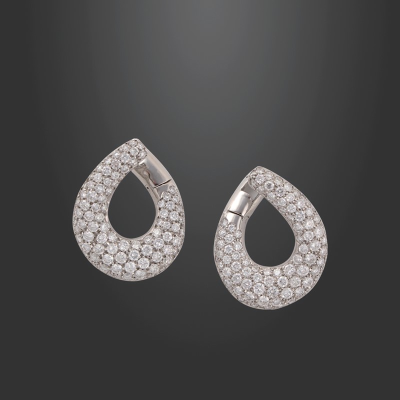 in oro bianco forma a goccia traforata con pavè in brillanti del peso complessivo di 7,50 ct ca., gr. 17,3.