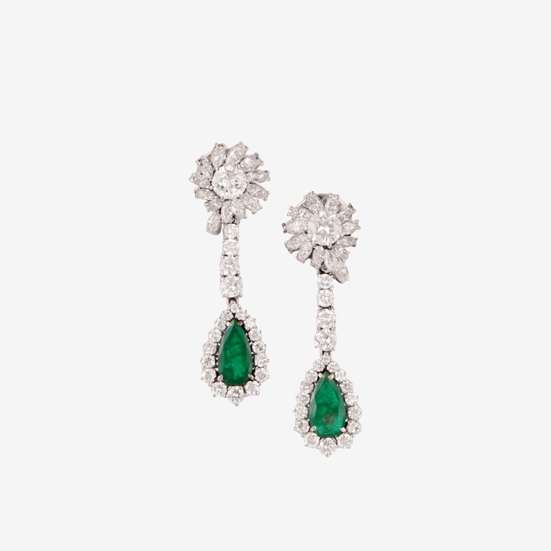 in oro bianco, pendenti con smeraldi forma a goccia, diamanti centrali del peso di 0,50 ct ca. cadauno, diamanti rimanenti ad ornamento del peso complessivo di 3,50 ct ca. gr. 14.