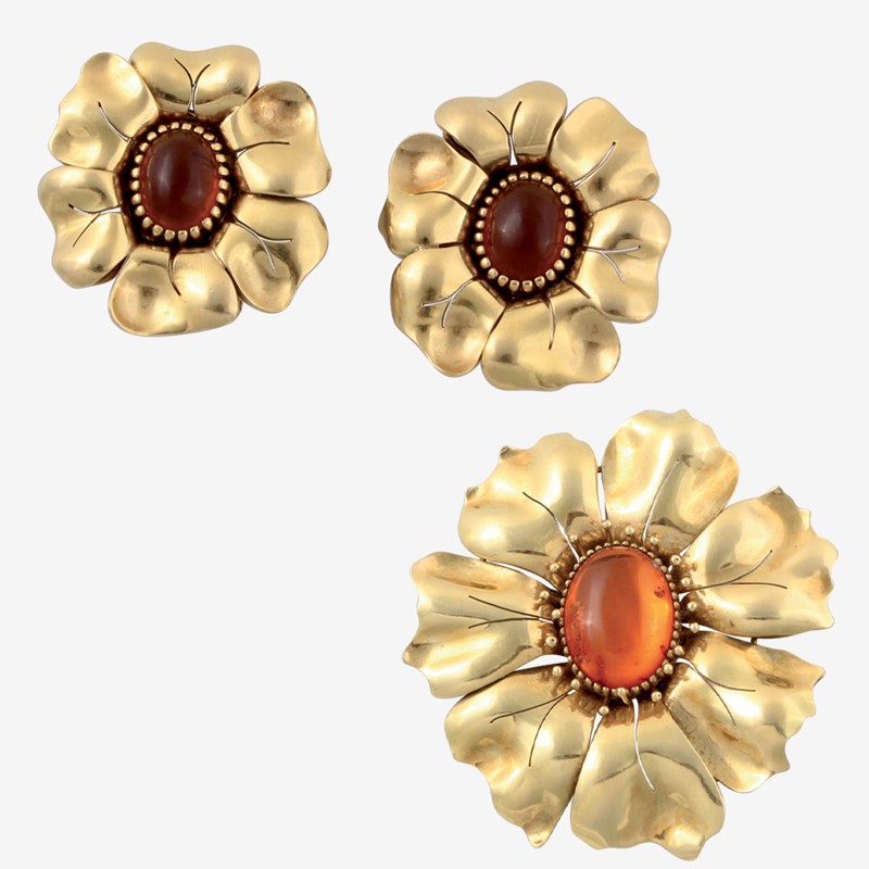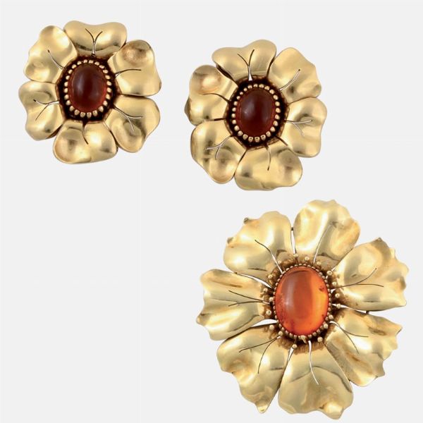 in oro giallo, a forma di fiore con ambra cabochon centrale, gr. 39,3.