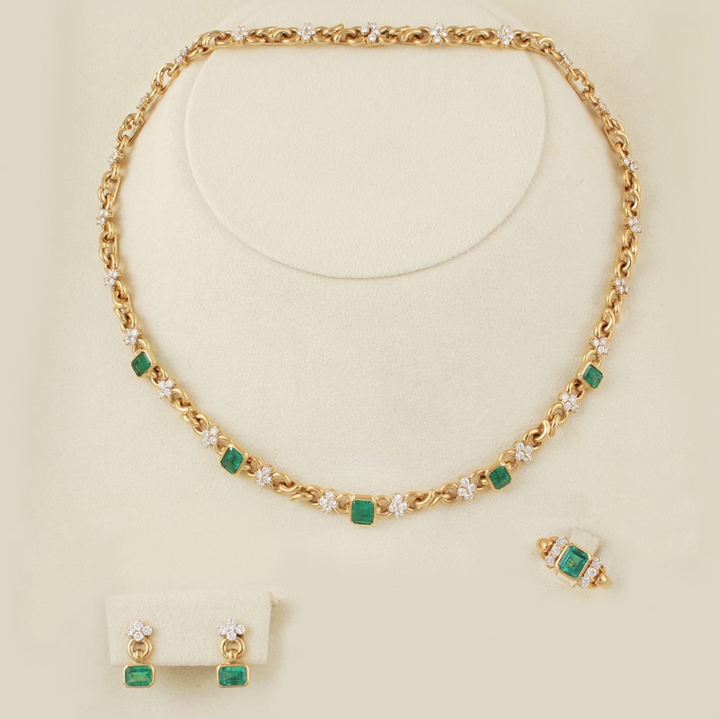 in oro giallo, collana, orecchini e anello con smeraldi del peso complessivo di 10,00 ct ca. e brillanti del peso complessivo di 4,80 ct ca., gr. 76,5. Corredata da custodia. Lunghezza collana 47 cm Misura anello 17