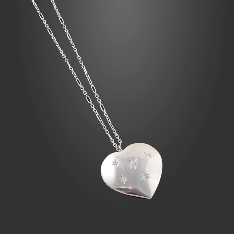 in oro bianco a forma di cuore bombato, piccoli brillanti, trattenuto da catena, gr. 10,3. Lunghezza collana 40 cm