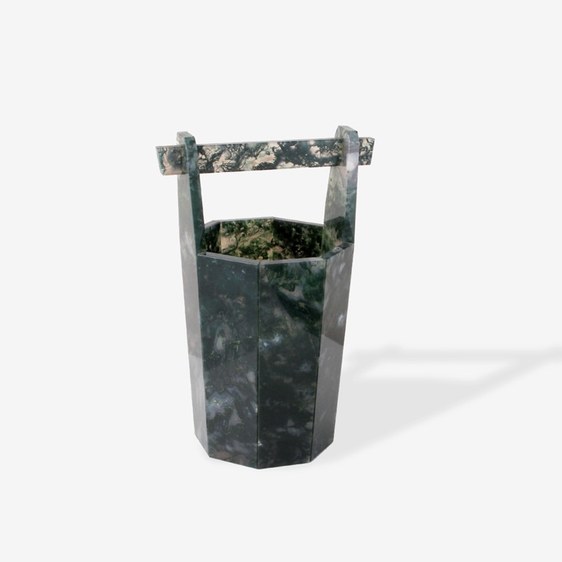 in agata muschiata, a lastre unite a forma di secchiello con manici. Dimensioni 14,9x7,4x8 cm
