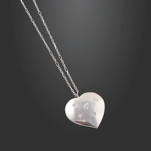 in oro bianco a forma di cuore bombato, piccoli brillanti, trattenuto da catena, gr. 10,3. Lunghezza collana 40 [..]