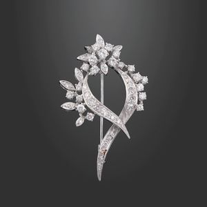 in platino a forma geometrica con volute, diamanti del peso complessivo di 5,50 ct ca., gr. 15,2.