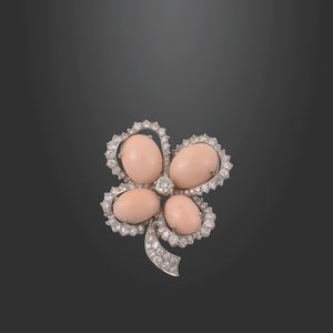 in oro bianco, a forma di quadrifoglio con corallo cabochon ornato da brillanti del peso complessivo di 2,00 ct [..]