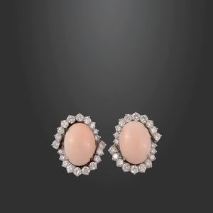 in oro bianco, corallo cabochon centrale e brillanti a contorno del peso complessivo di 1,00 ct ca., gr. 6,2. [..]