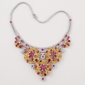 in oro bianco con motivi floreali atre rosoni centrali in corindoni gialli e rubini ornati da brillanti trattenuti [..]