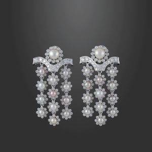 in oro bianco, pendenti con perle coltivate, diamanti del peso complessivo di 3,60 ct ca. gr. 33,7.