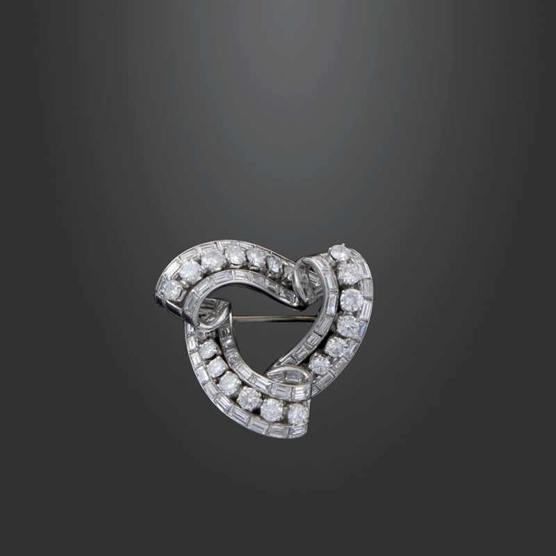 in platino a forma geometrica con volute, diamanti del peso complessivo di 5,50 ct ca., gr. 15,2.