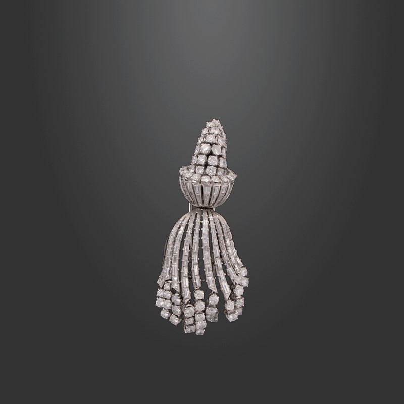 clip in platino a forma di vegetale, brillanti e diamanti baguette del peso complessivo di 12,00 ct ca., gr. 33,3. Numerario: 20 MI ( Cusi Gioiellieri )