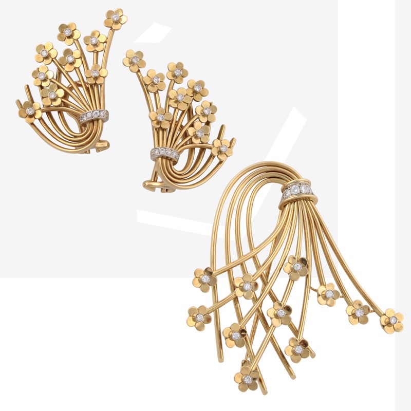 in oro giallo, a motivi floreali, piccoli brillanti, gr. 42,9. Anni ‘50
