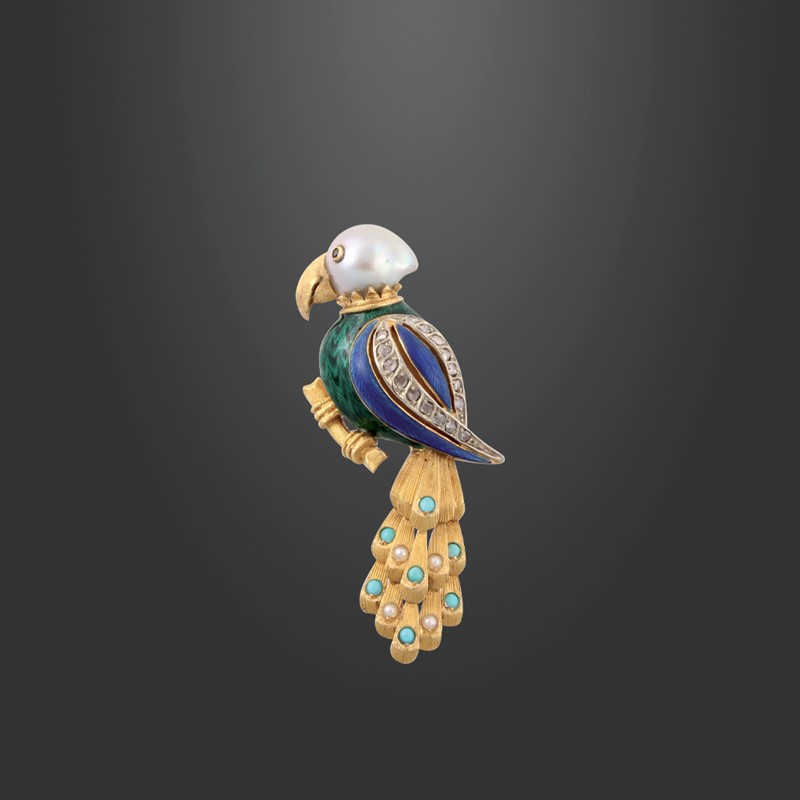 in oro giallo a forma di pappagallo, smalti nei toni del blu e verde (lieve mancanza), perle, turchesi e diamanti, gr. 16,6.