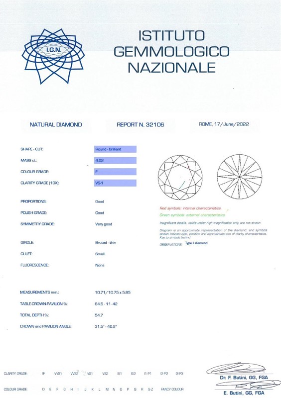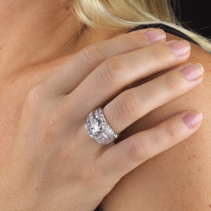 ANELLO A FASCIA CON DIAMANTI in oro bianco 18kt, al centro un diamante taglio brillante (smontato) di ct 4.02, colore F, purezza Vs1, affiancato da diamanti taglio baguette e brillante per ct 2.90 circa, punzone 750, mis. 54, gr. 10. Corredato di certificato IGN del 17/06/2022 attestante le caratteristiche della pietra centrale.