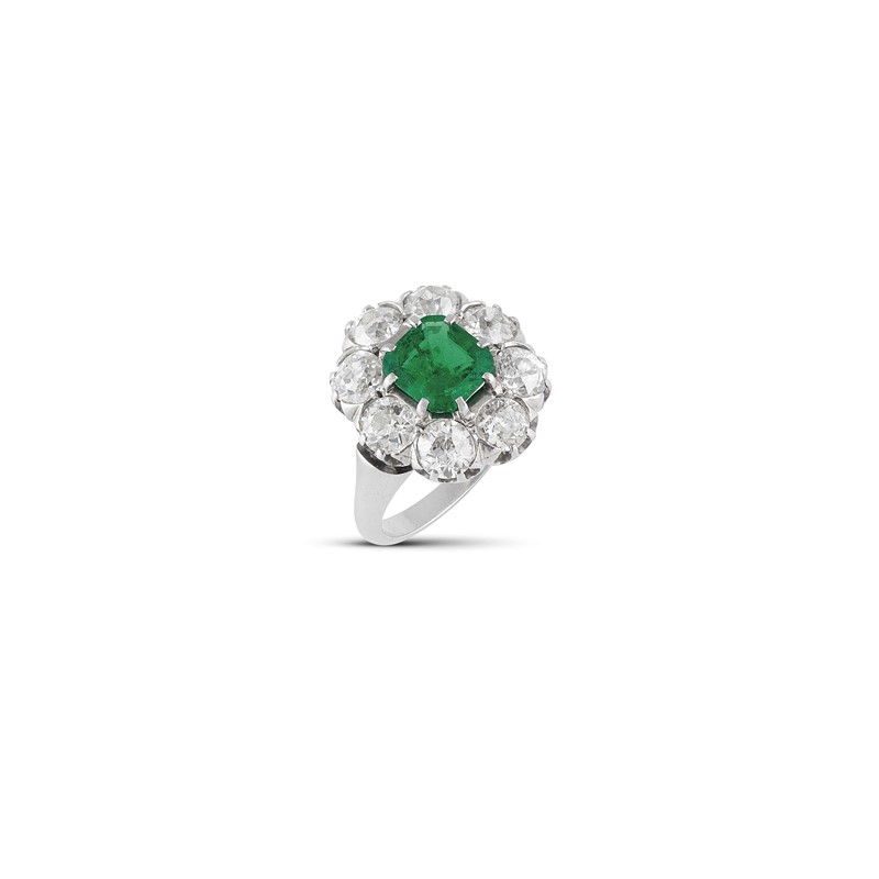 ANELLO A MARGHERITA CON SMERALDO COLOMBIANO E DIAMANTI in platino, al centro uno smeraldo colombiano taglio ottagonale di ct 1.80 circa, circondato da una fila di diamanti taglio vecchio per ct 2.80 circa, colore I/J, purezza Vs/SI, mis. 52, gr. 8. Corredato di certificato IGN del 24/10/2022 attestante le caratteristiche e l'origine della pietra.