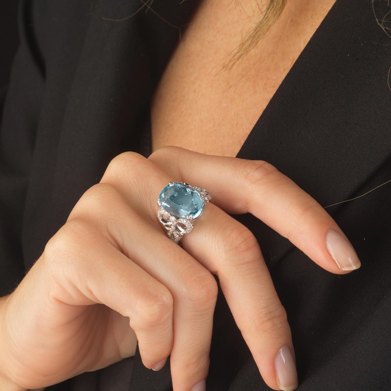 in oro bianco 18kt, al centro un'acquamarina taglio ovale di ct 9 circa, cinto da due fiocchi impreziositi da piccoli diamanti taglio brillante, mis. 57 gr. 9