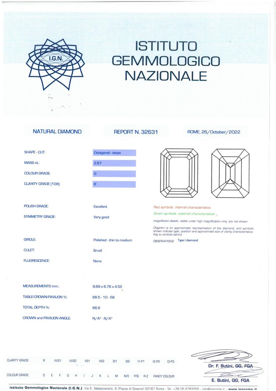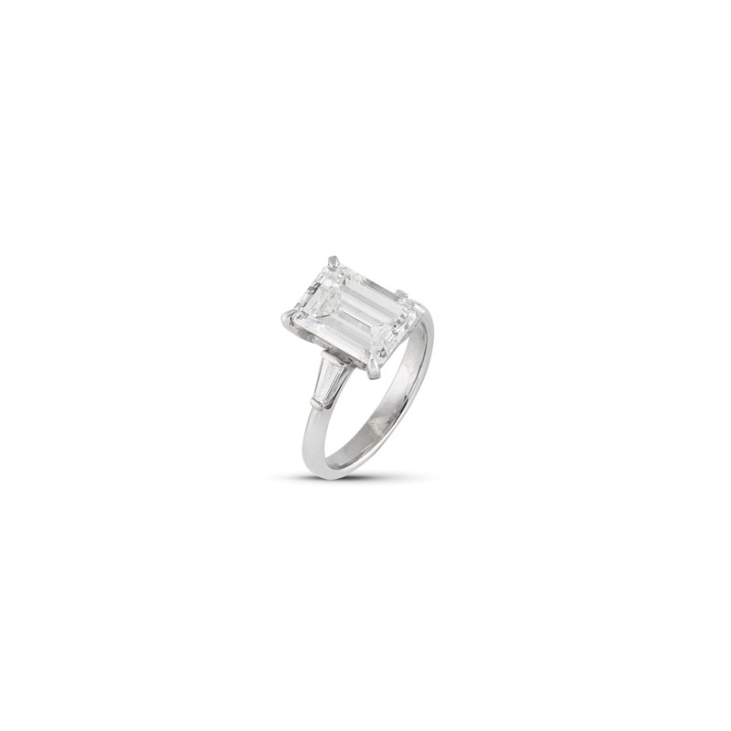 ANELLO CON DIAMANTE in oro bianco 18kt, al centro un diamante taglio ottagonale (smontato) di ct 2.67, colore G, purezza IF, affiancato da due diamanti taglio tapes per ct 0.30 circa, mis. 48, gr. 3. Corredato di certificato IGN del 26/10/2022 attestante le caratteristiche.