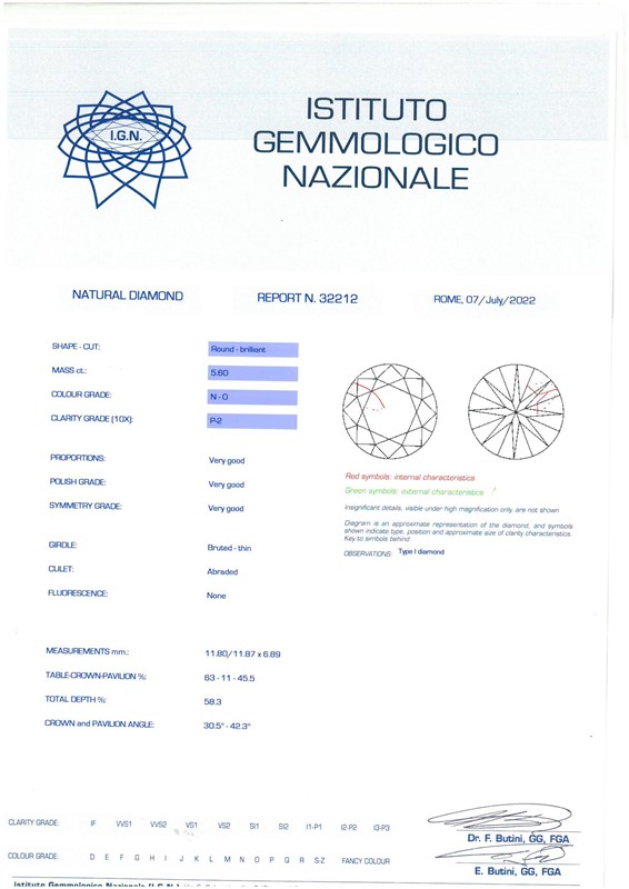 ANELLO CON DIAMANTE in oro giallo 18kt, diamante taglio brillante (smontato) di ct 5.60, colore N/O, purezza P2, punzone 750, mis 62, gr. 21. Corredato di certificato IGN del 07/07/2022 attestante le caratteristiche.