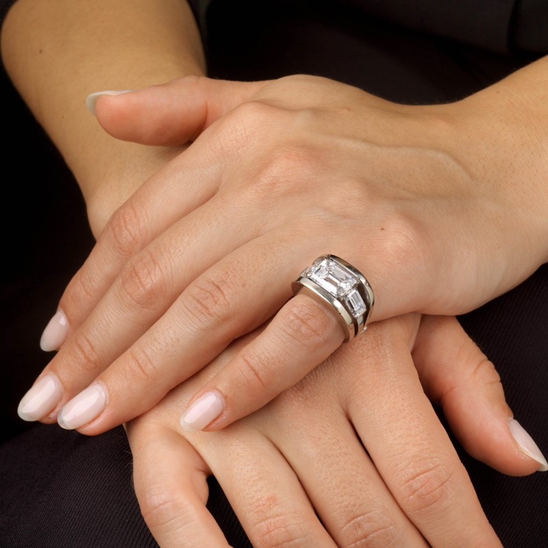 ANELLO CON DIAMANTI in oro bianco 18kt, recante al centro un diamante taglio ottagonale (smontato) di ct 3.89, colore E, purezza Vs1, affiancato da due diamanti taglio ottagonale (smontati) per ct 1.80, mis. 48, 13. Corredato di certificato IGN del 23/09/2022 attestante le caratteristiche della pietra centrale.