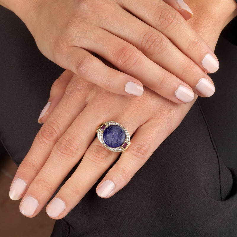 ANELLO CON PASTA VITREA RUBINI E DIAMANTI in oro giallo e bianco 18kt, dal profilo scanalato, recante al centro una pasta vitrea con profilo inciso circondata da diamanti taglio brillante per ct 0.20 circa e due rubini taglio baguette per ct 0.40 circa, punzone 750, mis. 62, gr. 12