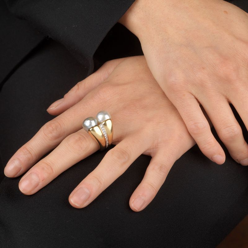 in oro giallo e bianco 18kt, impreziosito da una fila di diamanti taglio brillante per ct 0.10 circa e due perle sulla sommità di cui una bianca e una grigia di mm 10 circa, mis. 52, gr. 16