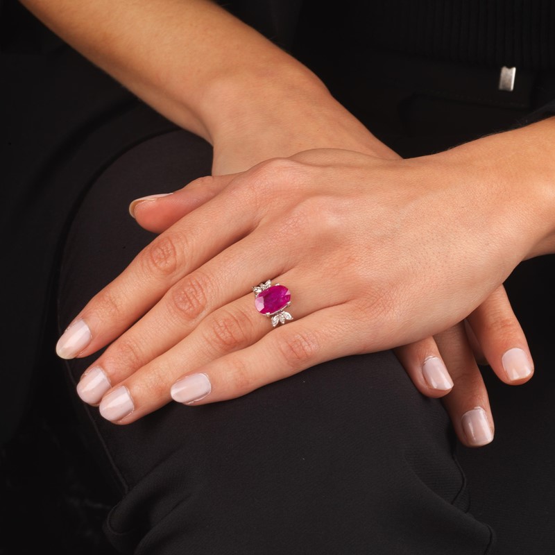 in oro 14kt, impreziosito da un rubino taglio ovale di ct 3 circa, affiancato da diamanti taglio navette per ct 0.30 circa, punzoni 14kt e 585, mis. 52, gr. 3