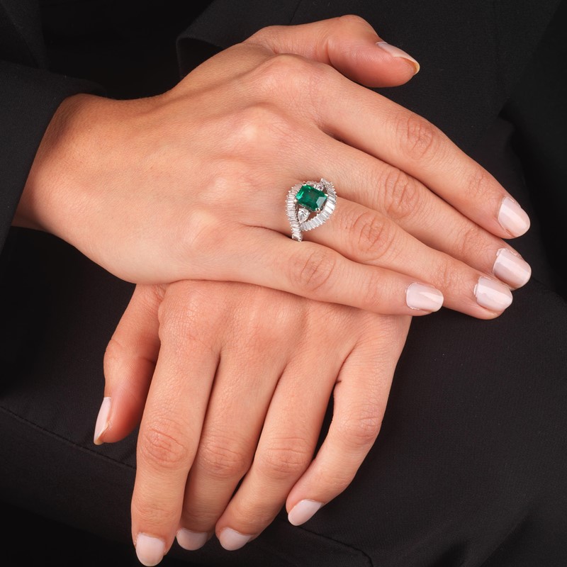 ANELLO CON SMERALDO ZAMBIA E DIAMANTI in platino, al centro uno smeraldo zambia taglio ottagonale di ct 1.65 circa, circondato da diamanti taglio baguette e a goccia per ct 2 circa, colore F/G, purezza IF/Vvs, mis. 52, gr. 8. Corredato di certificato IGN del 12/10/2022 attestante le caratteristiche e l'origine della pietra.